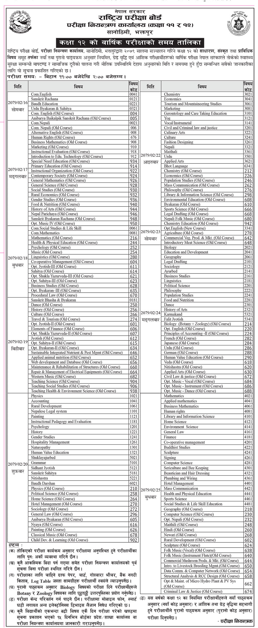 काठमाडौं : कक्षा १२ को वार्षिक परीक्षाको समय तालिका सार्वजनिक भएको छ । राष्ट्रिय परीक्षा बोर्ड, परीक्षा नियन्त्रण कार्यालय भक्तपुरले २०७९ जेठ १६ गतेदेखि हुने परीक्षाको समय तालिका सार्वजनिक गरेको हो ।