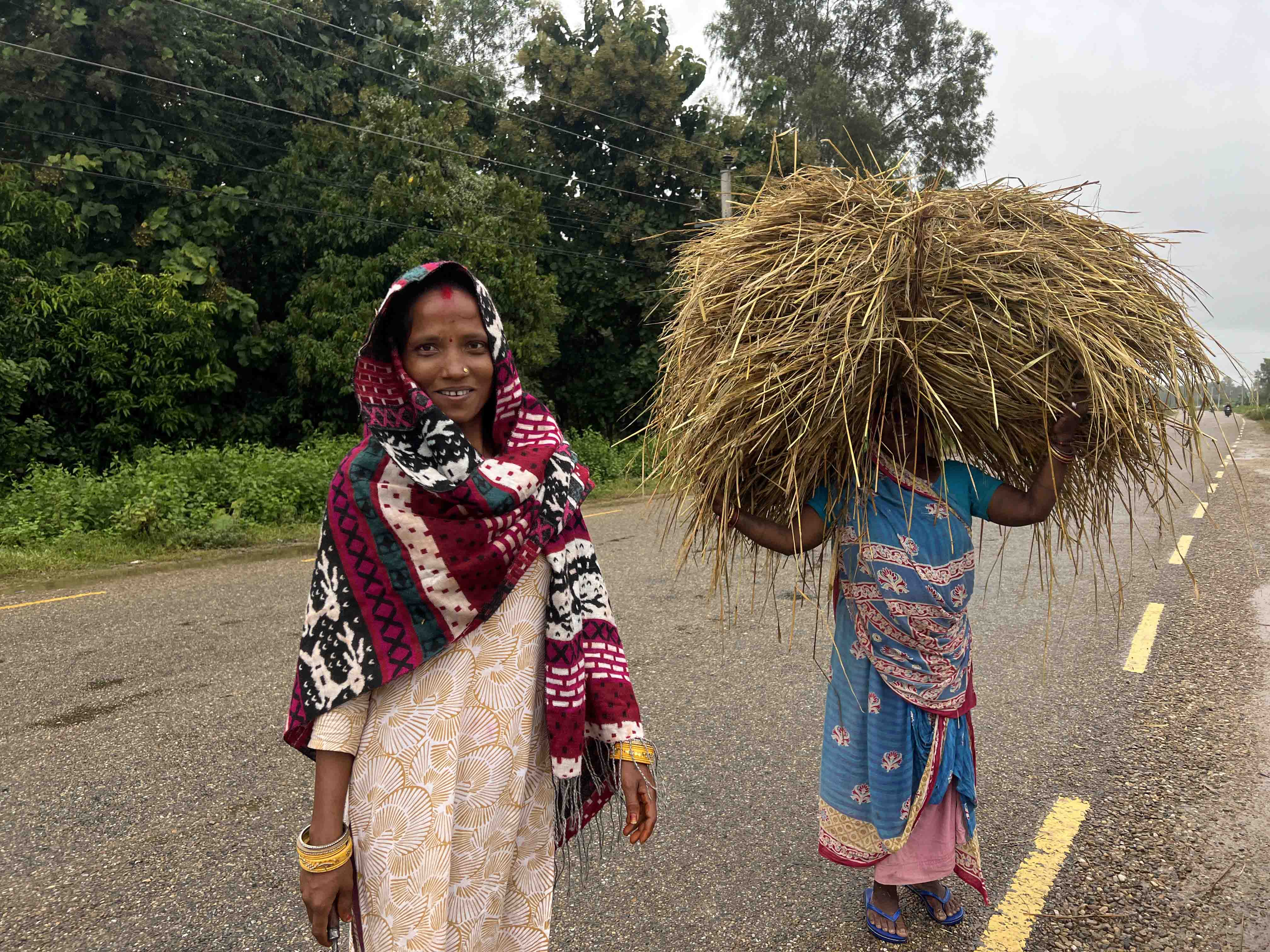 तस्बिर: सुनिता बराल, धान खेतबाट टाउकोमा धान नोक्सान भएको पराल बोकेर घर फकिएकी औरहीकी नैनीकुमारी