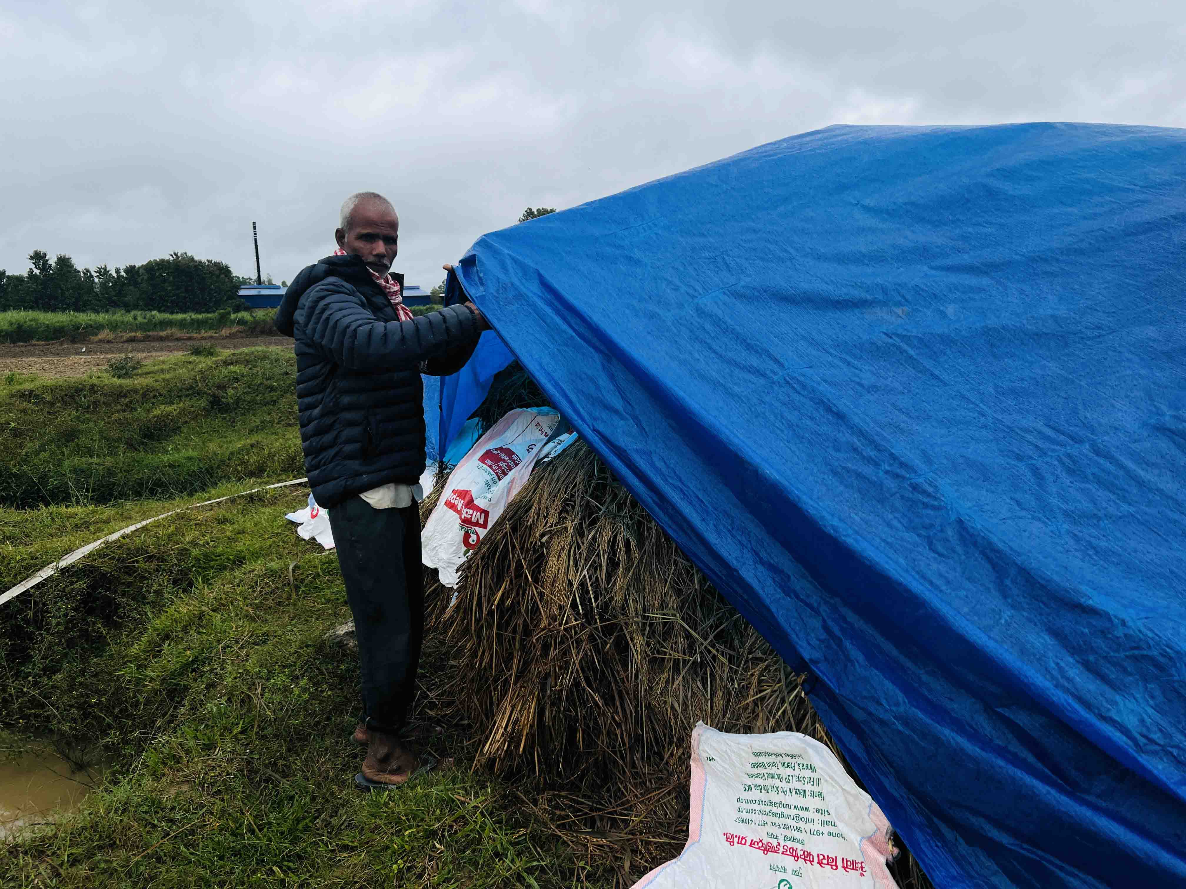 धान काटेर सुकाएकै समय पानी पर्न थालेपछि धान खेतभन्दा केहि पर खाली चौडिमा उनले चिसै धान जम्मा गरेर राखेका छन् । त्रिपाल र बोराले छोपछाप पार्दे धान जोगाउन कोशिस गरिरहेका उनलाई हावासंगै आउने वर्षाले हैरान बनाएको छ । केहि अग्लो स्थान भनेर उनले धान जम्मा गरेको ठाउ“मा पनि वर्षाको पानी भरिएको छ । धान थुपारेकै वरपर पनि पानी जमेर स–सना पोखरीनै बनिसक्दा उनलाई धान जोगाउ थप सकस परेको छ । “रातभर पर्ने पनीले अझ छट्पट्टि हुन्छ, तीनदिनदेखि निन्द्रै परेको छैन”, उनले सुनाए ।