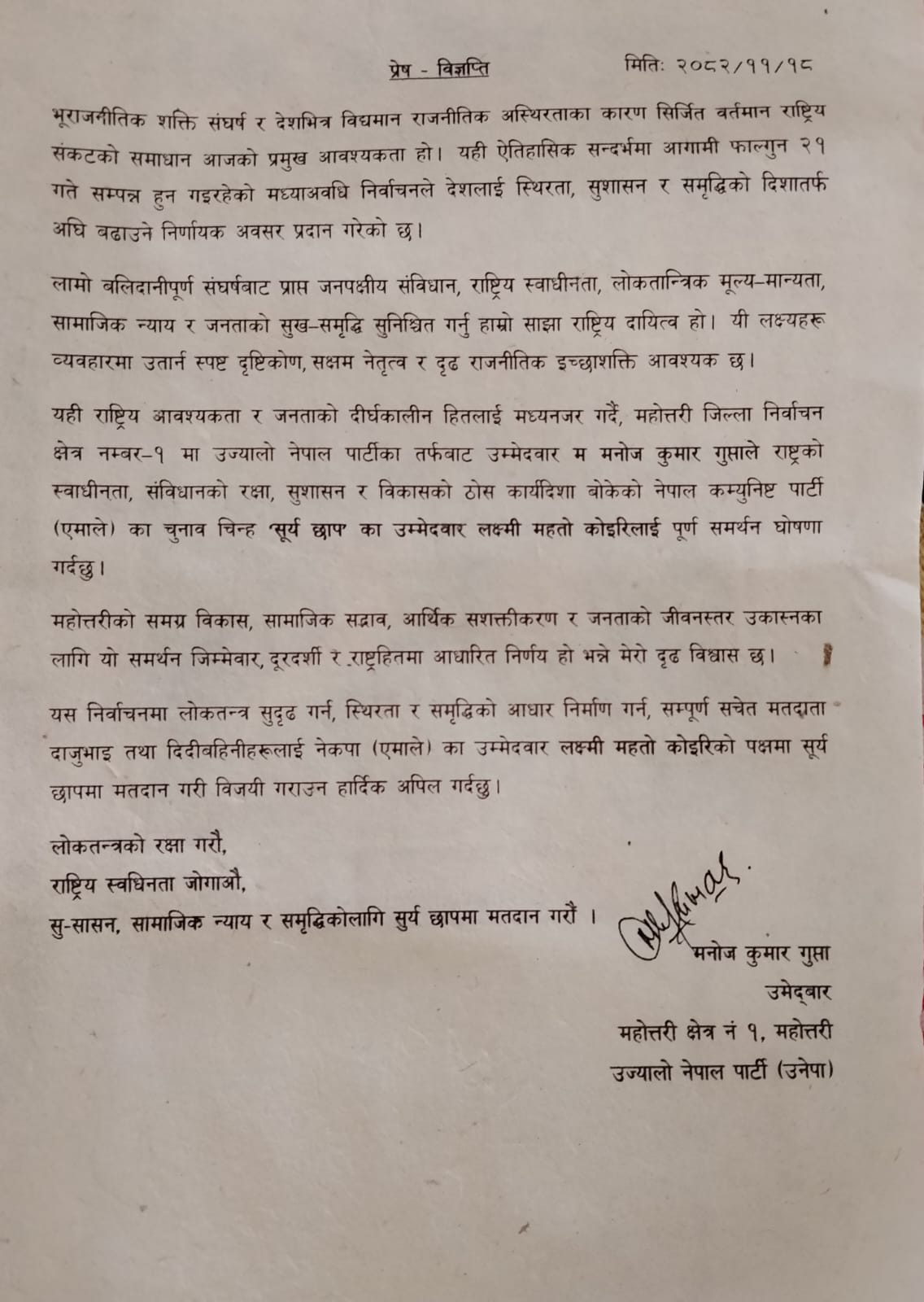 यही फागुन २१ गते हुने प्रतिनिधिसभा निर्वाचनमा महोत्तरी–१ बाट उज्यालो नेपाल पार्टीका उमेद्वार मनोजकुमार गुप्ताले आफ्नो उमेद्वारी निश्कृय गर्दै नेकपा (एमाले) का उमेद्वारलाई समर्थनको घोषणा गर्नुभएको छ । आज सोमबार बर्दिबासस्थित एमालेको निर्वाचन परिचालन कमिटीको कार्यालय पुग्नु भएका गुप्ताले पत्रकार सम्मेलनको आयोजना गरेर यस्तो घोषणा गर्नुभएको हो ।