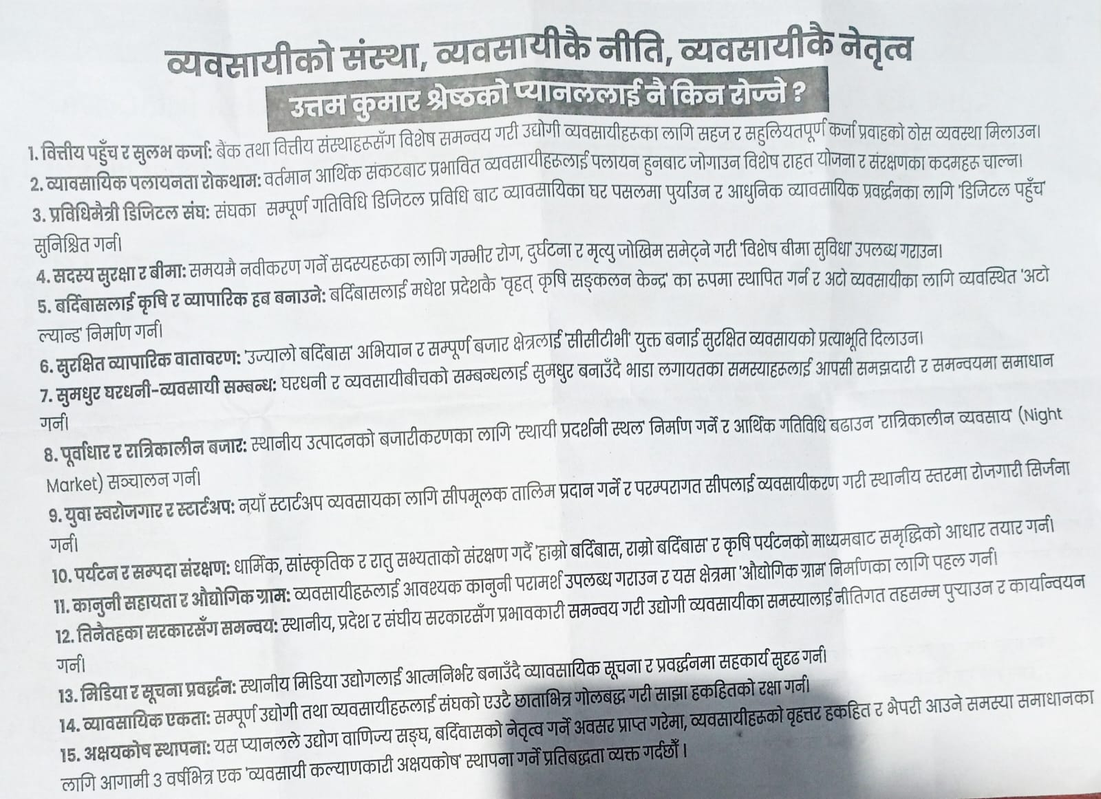 यो समूहले वित्तीय पहुँच र सुलभ कर्जा, व्यावसायिक पलायनता रोक्न ठोस पहलकदमी, प्रविधिमैत्री वाणिज्य सङ्घ, सदस्य सुरक्षा र बिमा एबं बर्दिबासलाई कृषि र व्यापारिक केन्द्र (हब) बनाउने प्रतिबद्धता व्यक्त गरेको छ । यसैगरी सुरक्षित व्यापारिक वातावरण, सुमधुर घरधनी तथा व्यवसायी सम्बन्ध, पूर्वाधार र रात्रीकालीन बजार, युवा स्वरोजगार र स्टार्टअप, पर्यटन र सम्पदा संरक्षण, सदस्यहरुको कानुनी सहायता र औद्योगिक ग्राम निर्माण तथा तीनै तहका सरकारबीच कुसल समन्वयको पहलकदमी लिइने यो समूहको प्रतिबद्धतापत्रमा उल्लेख छ । यसैगरी उत्तम समूहले मिडिया र सूचना प्रबद्र्धन व्यवसायिक एकता र कार्यकालभित्रै व्यवसायी कल्याणकारी अक्षयकोष स्थापनाको प्रतिबद्धता जनाएको छ ।